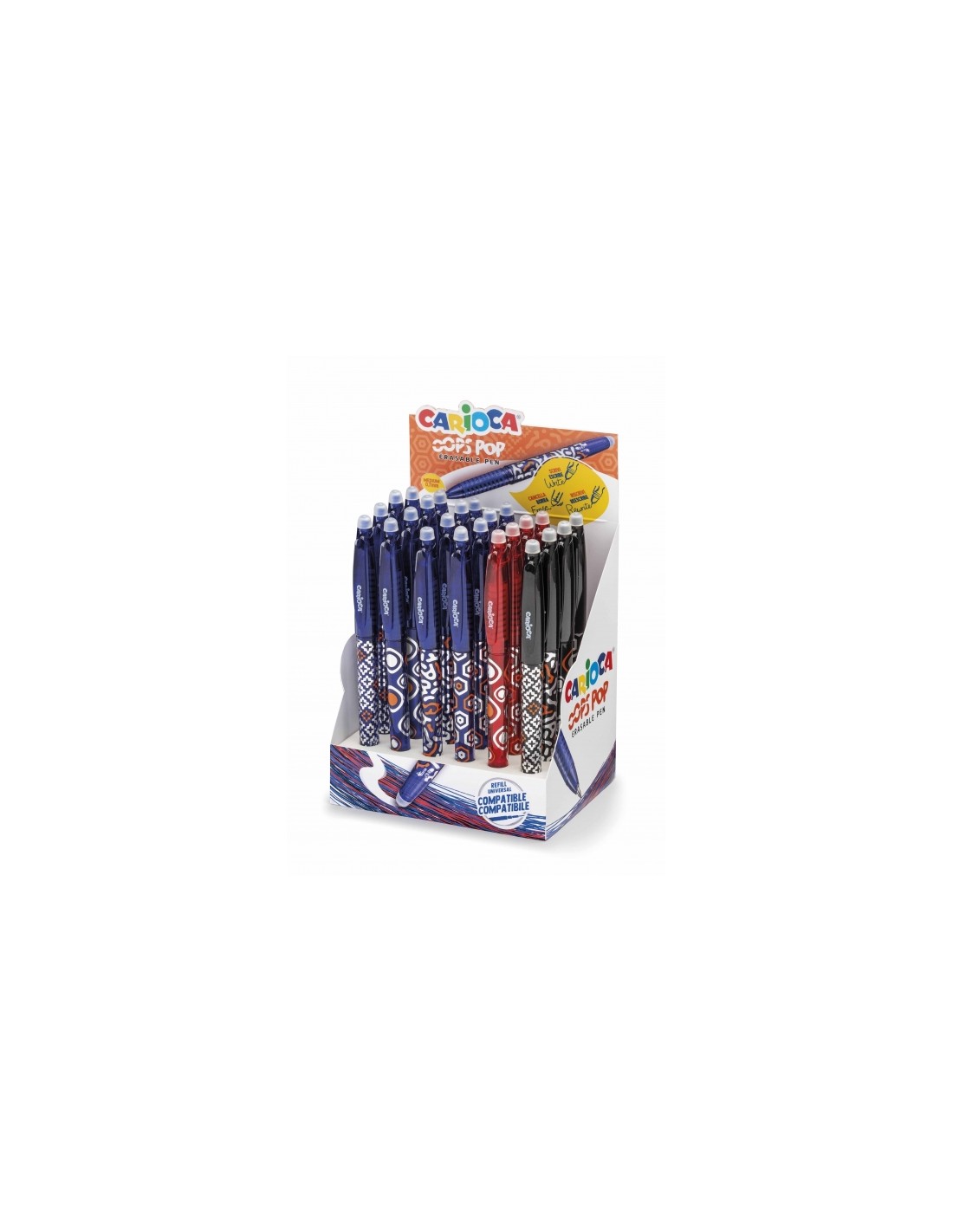 Expositor Carioca Oops Pop com 24 Canetas Apagáveis - Termossensível - Empunhadura Texturizada - Ponta de Ø 0,7mm - Borracha Dupla - Recargas Compatíveis Características: -Canetas apagáveis OOPS POP com tinta azul, vermelha e preta termossensível -Empunhadura texturizada -Ponta de Ø 0,7 mm -Borracha dupla -Recargas compatíveis